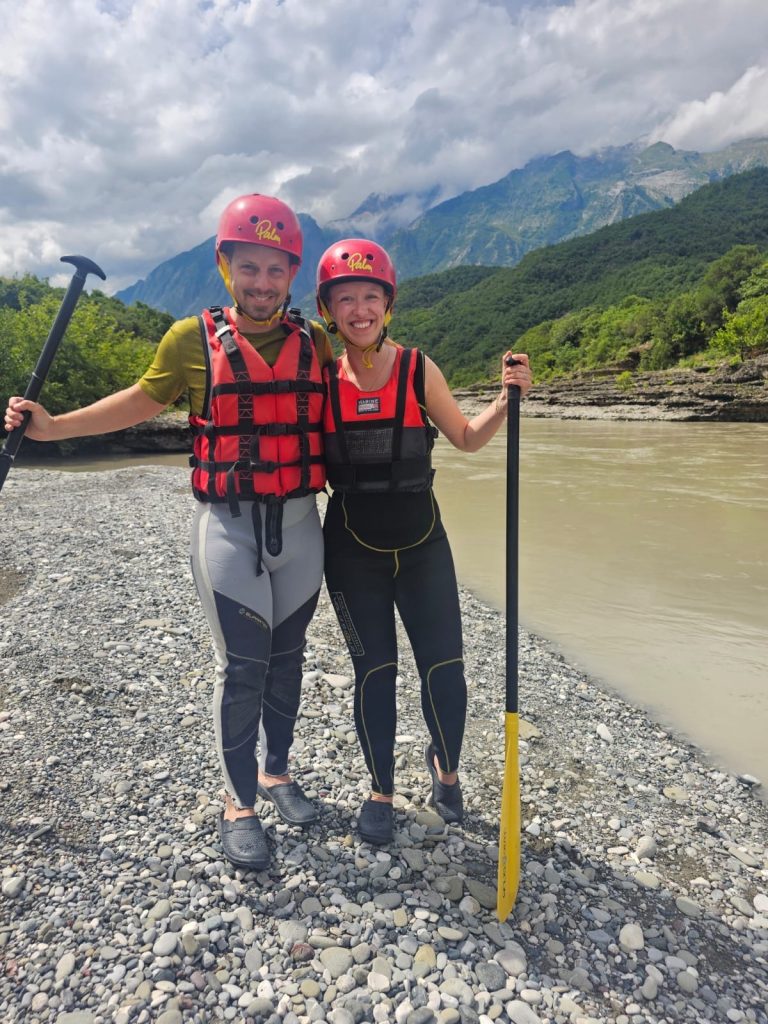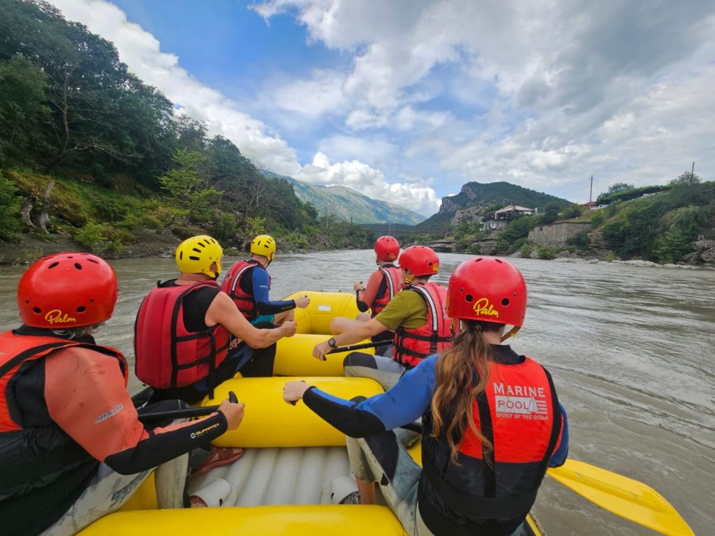 An unserer nächsten Unterkunft in der Nähe der Osum-Schlucht, wurde Rafting angeboten. Gesagt getan buchten wir ganz spontan für den kommenden Tag eine Rafting-Tour auf dem Osum See. Wir wurden in Neopren-anzüge gesteckt, bekamen einen Helm und ein Paddel in die Hand und wurden mit einem abenteuerlich ansehenden Bus Flussaufwärts gefahren. Da es die Tage zuvor ordentlich in den Bergen geregnet hatte, war der Fluss ein brauner, aufgewirbelter, reißender Strom. Perfekt fürs Rafting. Unser Guide buchvierte uns und sechs weitere Teilnehmer durch die Fluten. Sprung von der Klippe und per Rolle rückwärts zurück ins Boot inklusive.
