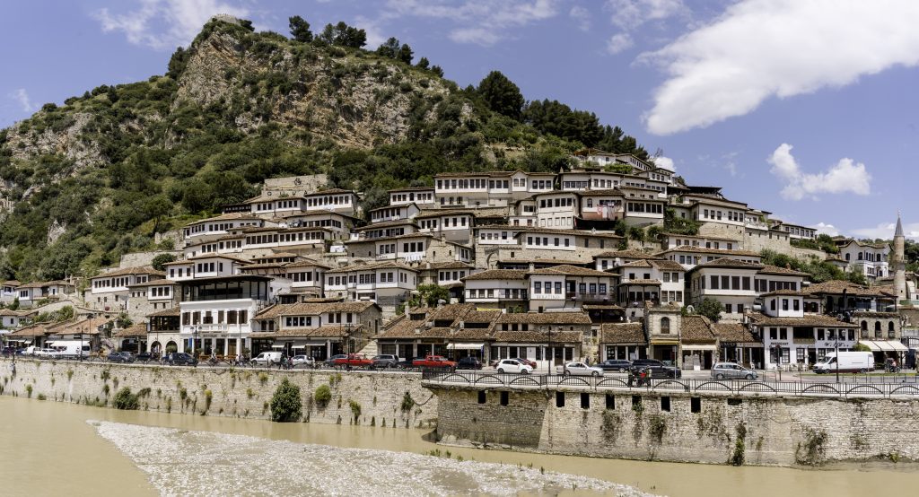 Berat ist ein in ganz Albanien bekanntes Postkartenmotiv. Wir hatten eine mini-Pension mitten in der historischen Burganlage. Verwirrend für uns, man konnte direkt in der Burganlage parken. Von der Burg aus sieht man auf die 1000 Fenster auf der anderen Seite des Osum.